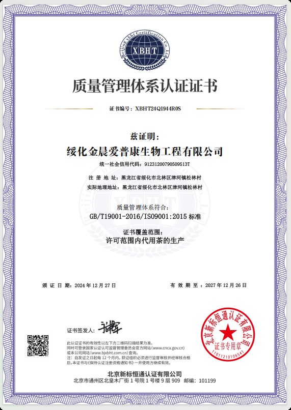 綏化金晨愛普康生物工程有限公司已成功通過質量管理體系認證,環(huán)境管理體系認證,職業(yè)健康管理體系認證。